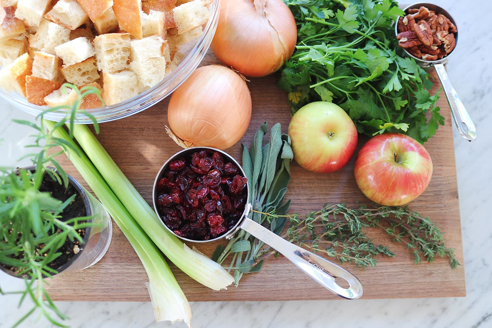 In a large pan over medium heat, add sausage. Use a wooden spoon to break up the sausage as it cooks. Continue cooking until sausage has browned, about 10 to 15 minutes. Remove sausage from pan onto a plate lined with paper towels. Keep the sausage fat in the pan and add the onions and celery. Cook until onions are translucent. Then add in the apples and cook for a couple minutes. Then add in all the herbs and cook for 1 minute. Remove from heat and set aside.