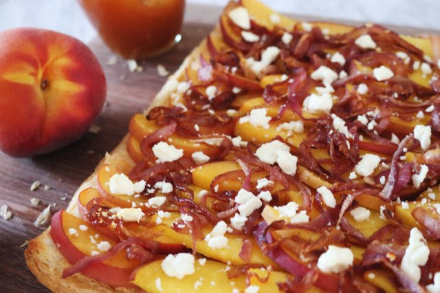 Spread the apricot preserves over the puff pastry. Then place sliced peaches over the preserves and top with the caramelized onions and feta cheese. Place back in the oven for 5 to 7 minutes. Remove from oven and allow to cool slightly before cutting.